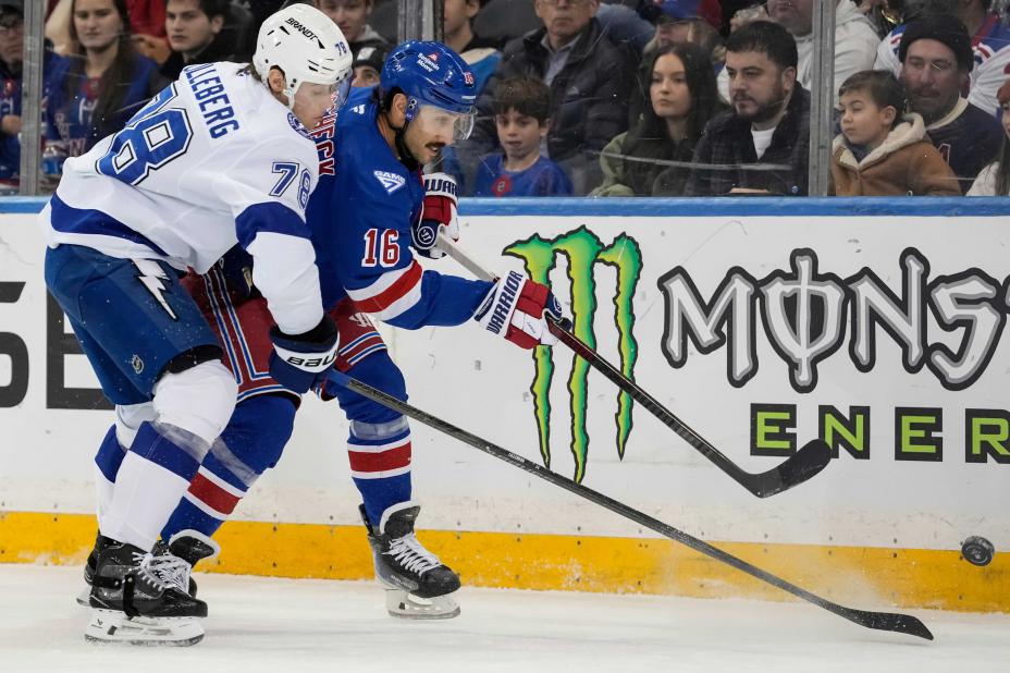 Emil Lilleberg i duell med New York Rangers-spiller Vincent Trocheck i Tampa Bay Lightnings 4-1-seier lørdag. Foto: Yuki Iwamura, AP / NTB