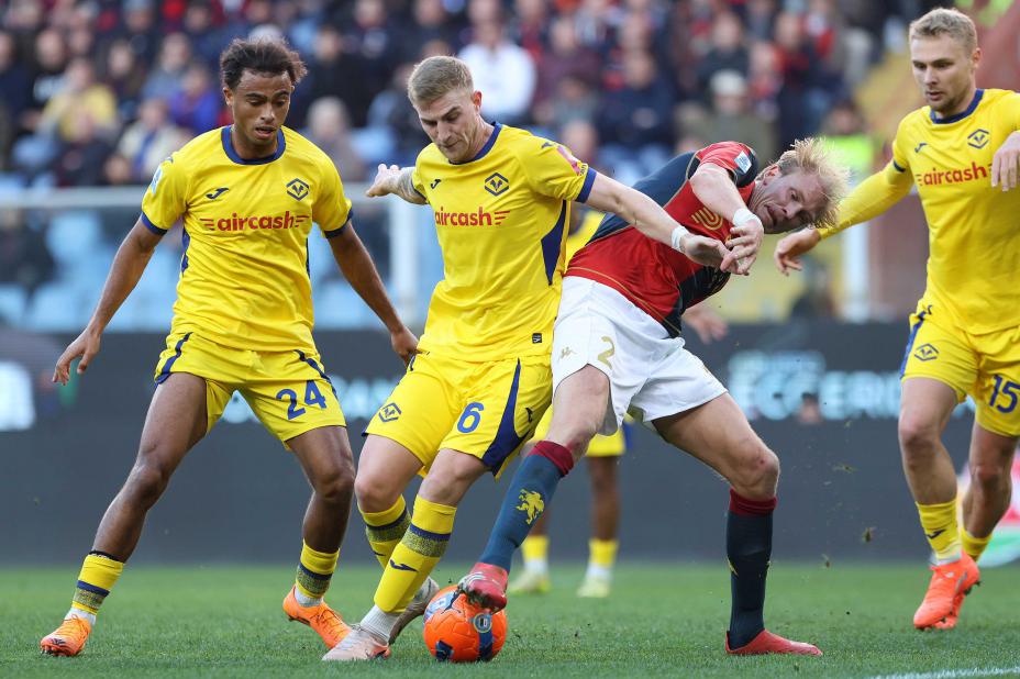 Morten Thorsby i duell med tre Hellas Verona-spillere i lørdagens bunnoppgjør i Serie A. Den norske landslagsspilleren ble matchvinner for Genoa. Foto: Tano Pecoraro, LaPresse via AP / NTB