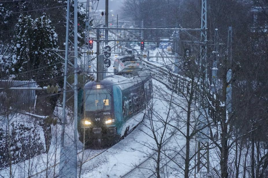 Tog har lang bremselengde og kan ikke svinge unna. Det forsøker Bane Nor nå å lære skoleelever etter en økning i hendelser med barn ved jernbanen. Arkivfoto av VY-tog mellom Skøyen og Lysaker. Foto: Lise Åserud / NTB