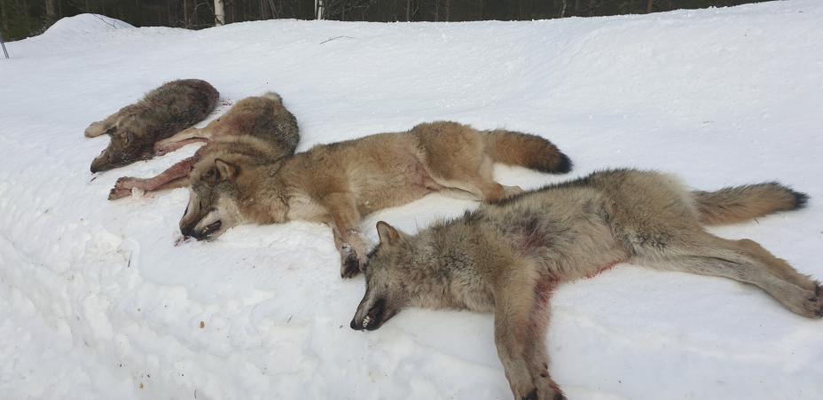 Klima- og miljødepartementet har avvist alle klager på at årets kvote for felling av ulv. Når lisensfellingen starter opp mandag, er det derfor en kvote på 27 dyr utenfor ulvesonen som gjelder. Disse fire ulvene ble felt i Letjennareviret i Elverum i 2020. Arkivfoto: Statens Naturoppsyn / NTB