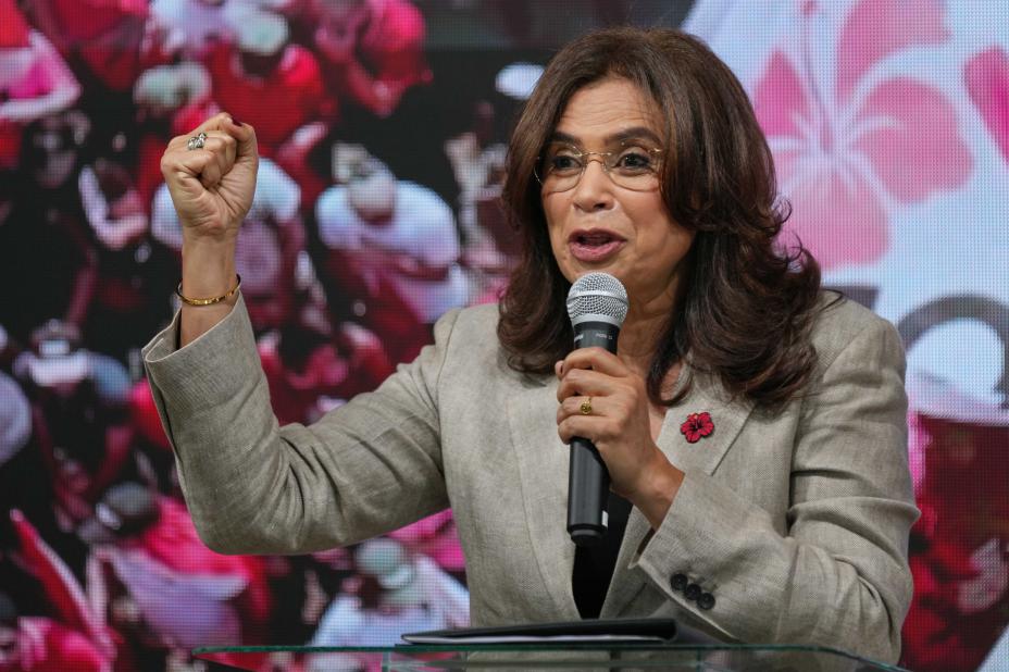 Kandidaten til Honduras’ regjeringsparti, sosialdemokraten Rixi Moncada, snakker på en pressekonferanse før valget. Foto: Moises Castillo / AP / NTB