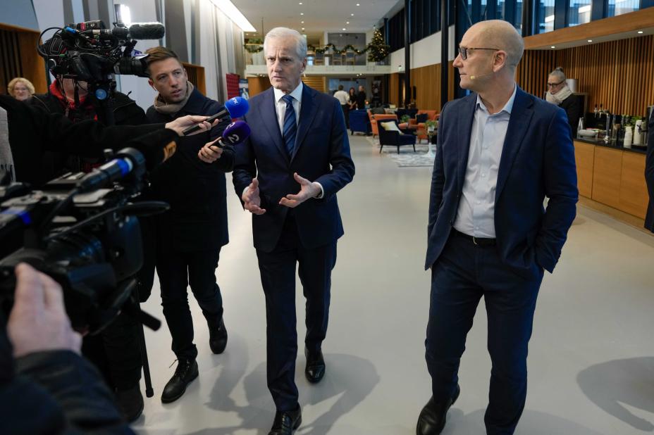 Politikk: – Nå skal vi snakke godt sammen. Jeg har tid og respekt for politiske samtaler. Nei, det er ikke krise nå, sier Støre til NRK og TV 2 på vei inn på en konferanse med Unio på Sundvolden Hotel mandag ettermiddag.