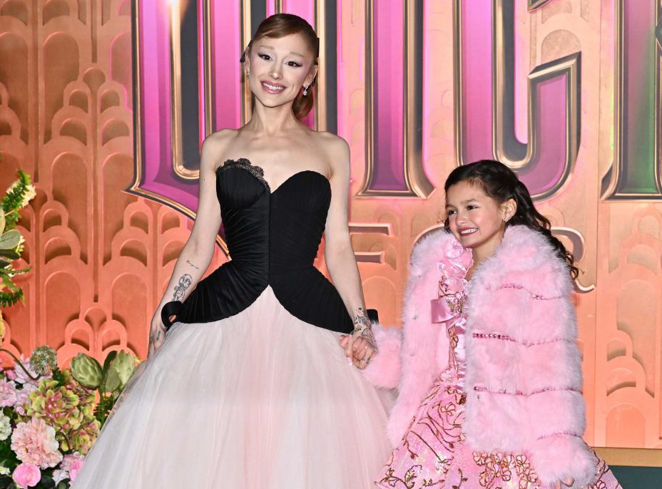 Ariana Grande med unge Scarlett Spears, som spiller Galinda/Glinda som barn i «Wicked: For Good». Foto: Evan Agostini/Invision/AP/ NTB