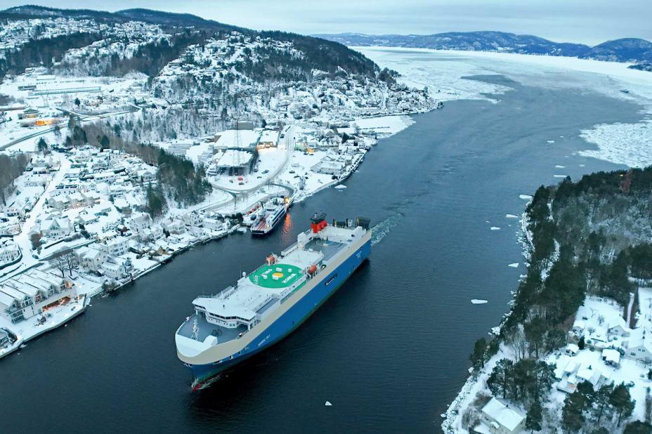 Svelvikstrømmen midtveis i Drammensfjorden, er 180 meter bred på det smaleste og har den nest sterkeste strømmen i Norge, etter Saltstraumen i Bodø. Her er et biltransportskipet Nordic Ray, 125 meter langt og 25 meter bredt, på vei til Drammen i februar 2024. Foto: Hans O. Torgersen / NTB