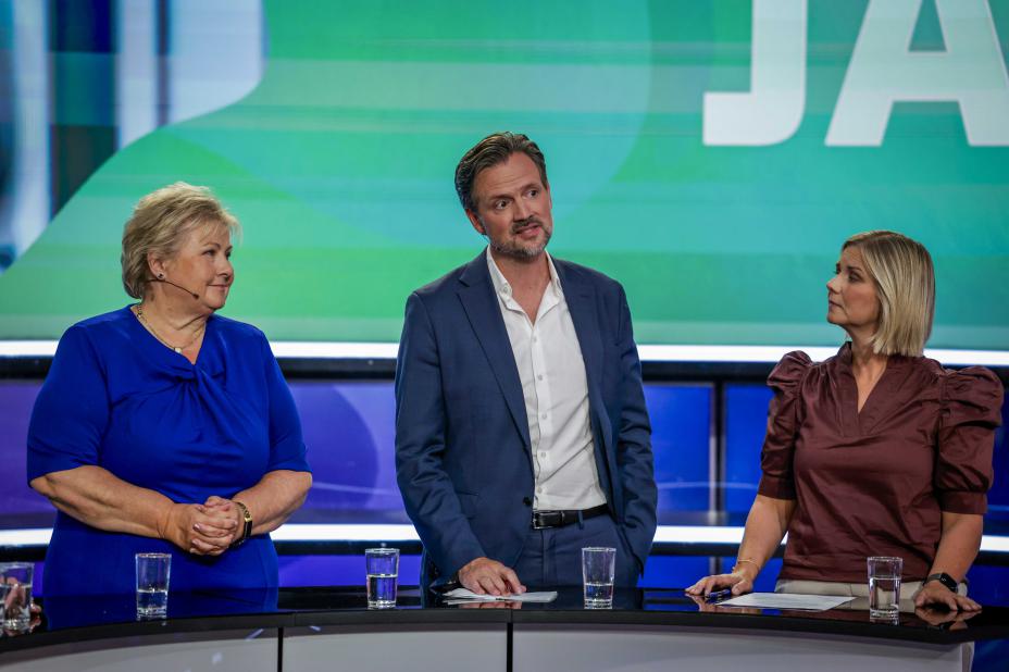 Høyre-leder Erna Solberg, KrF-leder Dag-Inge Ulstein og Venstre-leder Guri Melby. De tre partiene sier nå ja til å være med på en skattekommisjon. Frp sier nei. Foto: Paul S. Amundsen / NTB