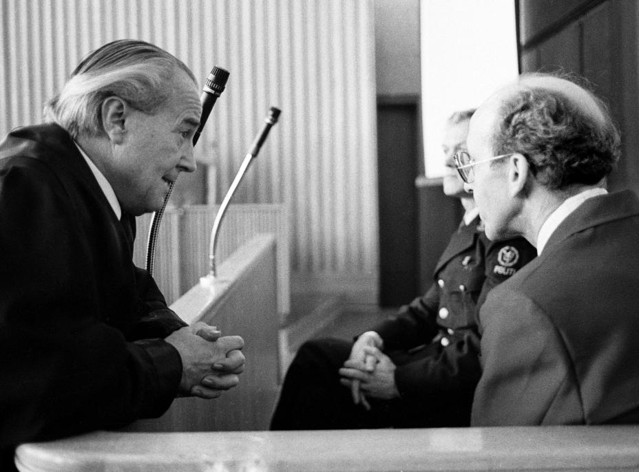 Sykehjemsbestyrer Arnfinn Nesset (46) (t.h) i samtale med sin forsvarer, høyesterettsadvokat Alf Nordhus, under rettssaken i Frostating lagmannsrett 19. oktober 1982. Foto: Erik Thorberg / NTB / NTB