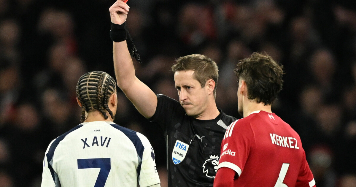 «Etter VAR-gjennomgang omgjorde dommeren den opprinnelige avgjørelsen om gult kort til Simons og utstedte et rødt kort for farlig spill», skriver Premier League Match Centre på X.