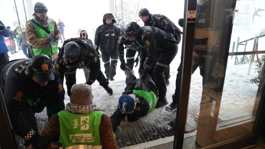 Demonstranter fra blant annet Natur og ungdom, XR og Framtiden i våre hende møtte opp for å markere motstand mot regjeringens oljepolitikk.