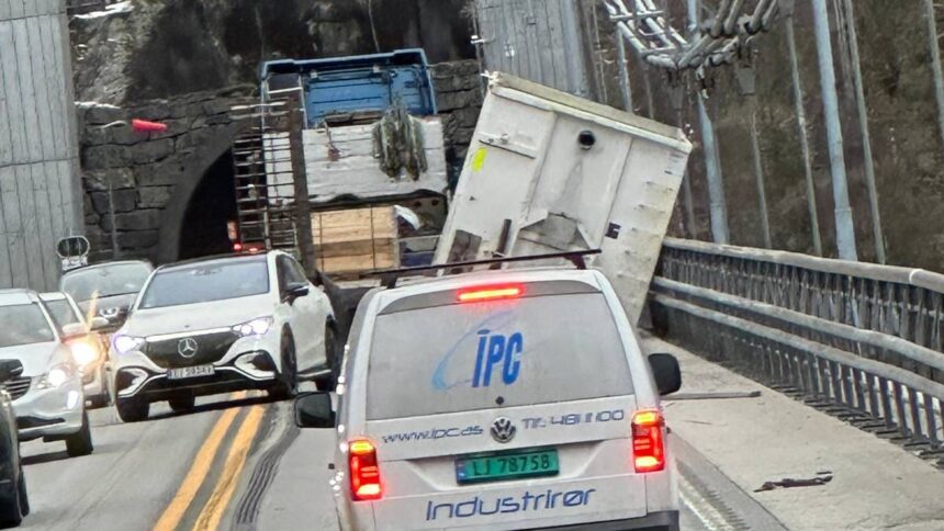 Container falt av lastebil på Feda bru. E39 ble stengt – NRK Sørlandet – Lokale nyheter, TV og radio