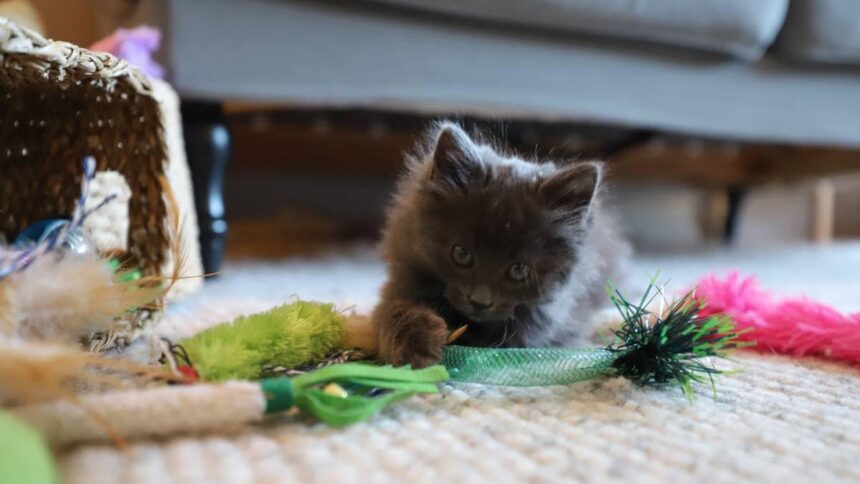 En liten pelsdott på 8 uker har valgt seg ut noen leker blant et bredt utvalg i sitt nye fosterhjem.