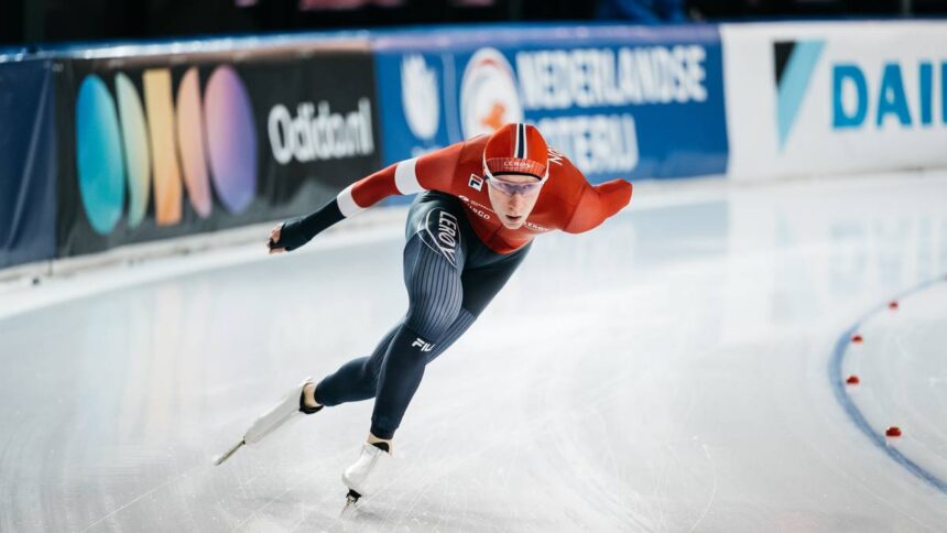 Skøyteløperen Peder Kongshaug fra Stavanger er flaggbærer under åpningsseremonien av årets Vinter-OL.