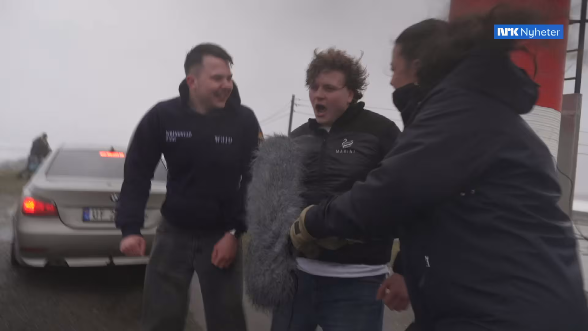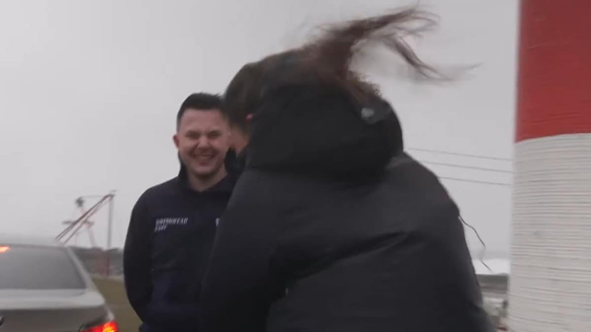 Reporter Elise Pedersen intervjuer to personer ved Kvassheim fyr, mens de nesten blåser over ende.