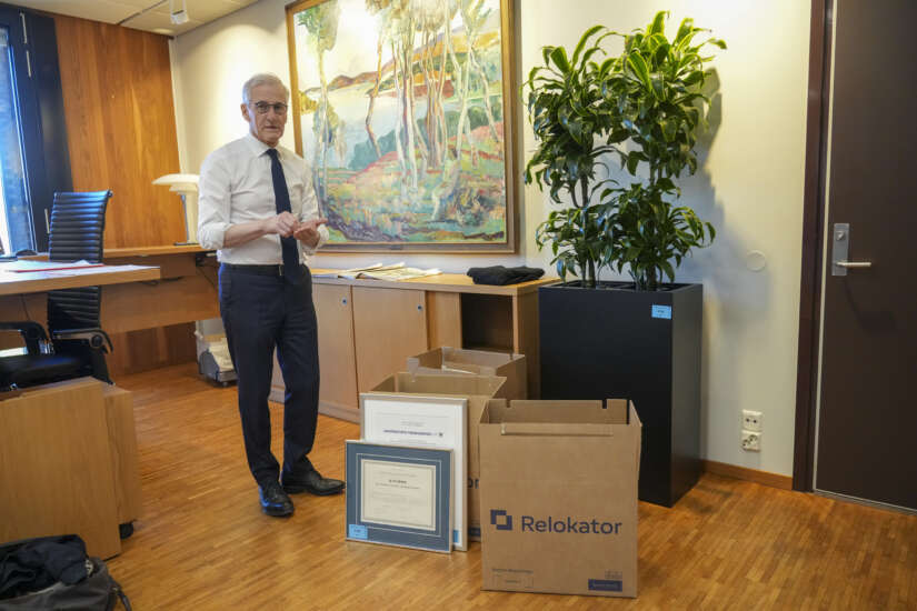 På gulvet står Støres tre tildelte kasser. De skal fylles med det han vil ha med til det nye kontoret – papirer han vil ta vare på, notatbøker og personlige kunstgjenstander og effekter. Blant annet en snodig hjelm prydet med norsk flagg og påskriften «STATSMINISTER».