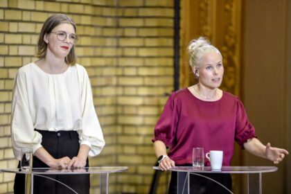 Marie Sneve Martinussen og Kirsti Bergstø under partilederrunden på Stortinget natt til…