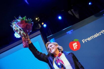 Partileder Sylvi Listhaug taler under Fremskrittspartiets valgvake på Hotel Bristol. Partiet fikk…