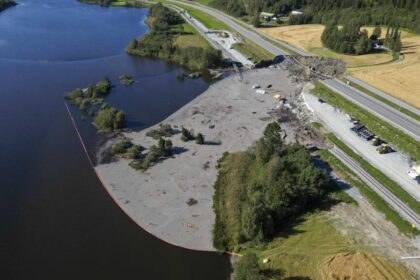 Dronebilde over raset ved Nesvatnet utenfor Levanger. Nå vil Bane Nor gå…