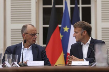 Tysklands forbundskansler Friedrich Merz og Frankrikes president Emmanuel Macron foran en arbeidsmiddag…