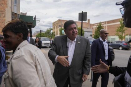 Guvernøren i Illinois J.B. Pritzker snakker med folk utenfor restauranten Cleo's Southern…
