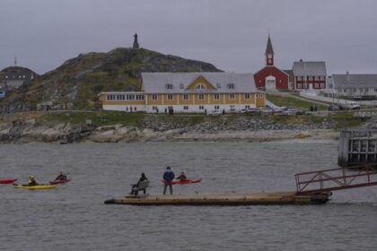 Turister i kayak med Nuuk-katedralen i bakgrunnen. Foto: Kwiyeon Ha / AP…