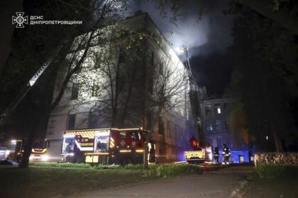 Brannmannskaper slukker en brann i en bygning i Dnipro etter et russisk…