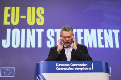 EUs handelskommissær Maros Sefcovic på torsdagens pressekonferanse i Brussel. Foto: Virginia Mayo…