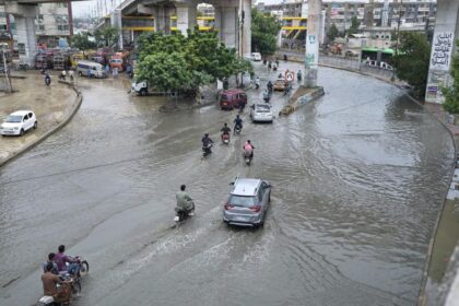 Motorsyklister og bilister navigerer seg gjennom en oversvømt vei i Karachi i…