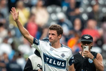 Vancouver Whitecaps' Thomas Müller hilser til publikum etter kampen. Foto: Ethan Cairns…
