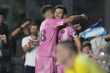 Lionel Messi (høyre) blir omfavnet av Jordi Alba (nummer 18) etter at…