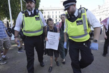 En eldre dame innbringes av politibetjenter foran det britiske parlamentet. Foto: Stefan…