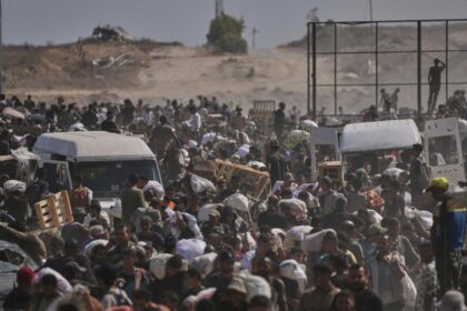 Palestinere med nødhjelpspakker nær et distribusjonssenter drevet av den USA-støttede organisasjonen Gaza…