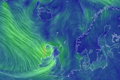 Stormens sentrum befant seg ved de britiske øyer i 09-tiden mandag. Illustrasjon…