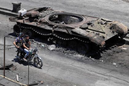 Drusisk milits på motorsykkel ved en utbrent stridsvogn i Sweida i slutten…