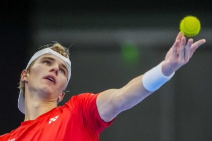 Nicolai Budkov Kjær leverte god tennis i Kasakhstan søndag. Her fra en…