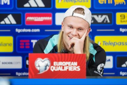 Erling Braut Haaland under en pressekonferanse med Norges herrelandslag i fotball på…