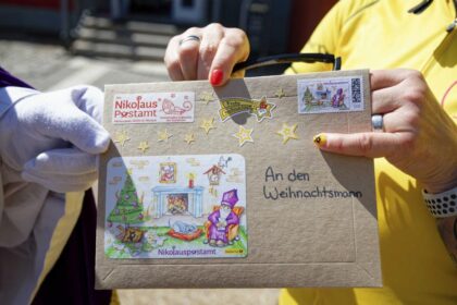 Nissen i St. Nikolaus overrekker et brev som skal fraktes med sykkel…