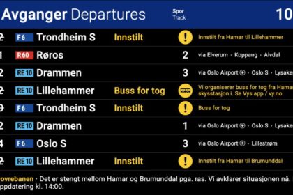 Bane Nor har stengt togtrafikken mellom Hamar og Brumunddal på Dovrebanen fordi…