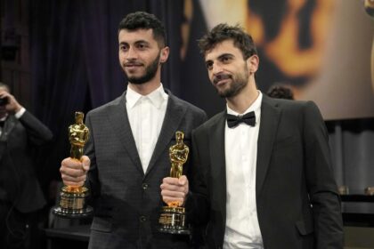 Basel Adra (t.v.) sammen med den israelske medregissør Yuval Abraham, vant i…