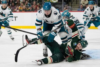 San Jose Sharks' Dmitry Orlov (9) og Minnesota Wilds Mats Zuccarello (36)…