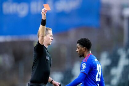 Kristoffer Hagenes viser ut Brice Ambina i søndagens eliteseriekamp på Lerkendal. Foto:…