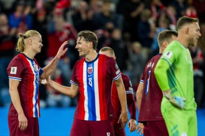 Erling Braut Haaland og Sander Berge etter 5-0 målet mot Israel i…