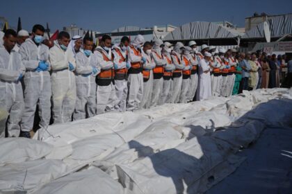 Et medisinsk team ber en bønn over drepte palestinere som ikke er…