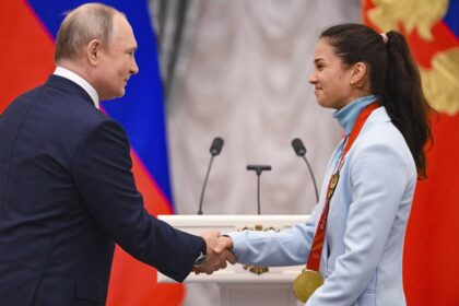 Den russiske langrennsløperen, her med landets president Vladimir Putin, reagerer kraftig på…