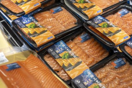 Norsk laks i supermarkedkjeden Hema Fresh i Shanghai i fjor. Eksporten til…