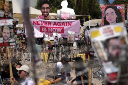 Gislenes familier demonstrerer i Tel Aviv. Foto: Ariel Schalit / AP /…