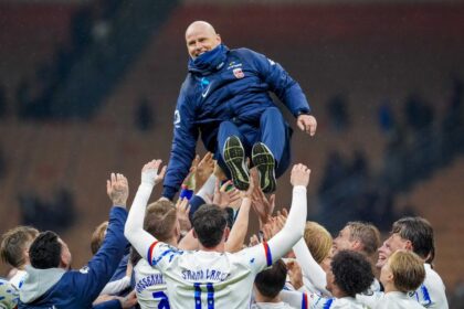Norges landslagssjef Ståle Solbakken blir kastet i været etter 4-1-seieren mot Italia…