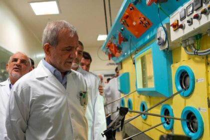 Irans president Masoud Pezeshkian på et iransk atomanlegg i hovedstaden Teheran søndag.…