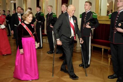 Dronning Sonja og Kong Harald på vei inn til stortingsmiddagen på Slottet.…