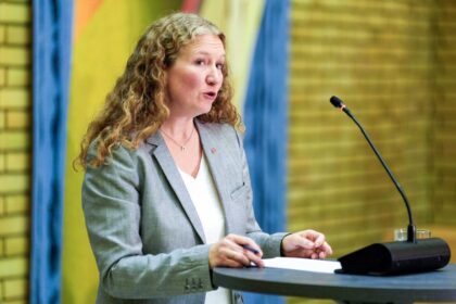 Tuva Moflag under pressetreff i vandrehallen på Stortinget tirsdag ettermiddag. Foto: Terje…