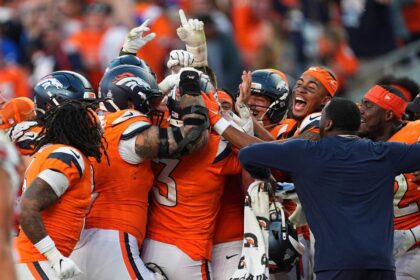 Denver Broncos-spillerne jubler etter at kicker Wil Lutz fullførte det usannsynlige comebacket…