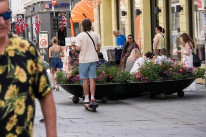 En elsparkesyklist på gågatedelen av Karl Johans gate. Foto: Terje Bendiksby /…